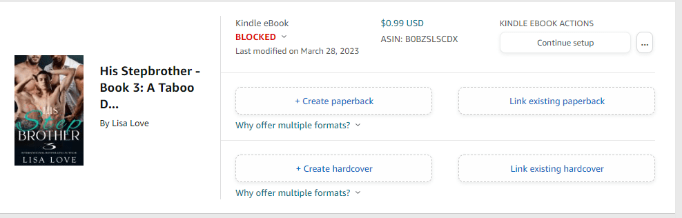 May 13th: Amazon closed down my account. They have recently restored it under the condition that I remove all titles that don’t adhere to their Content guidelines. You can still find all my taboo titles over at Google and Smashwords
